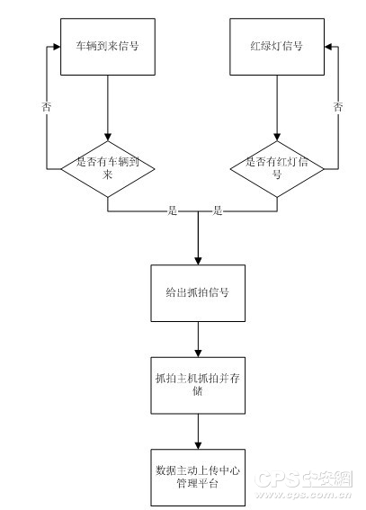 (1)当信号检测器检测到红灯信号并有车辆离开线圈A时,系统触发抓拍第一张图片同时进行车辆号牌的识别,如为卡口型电警则将此图片作为卡口抓拍图片并记录。